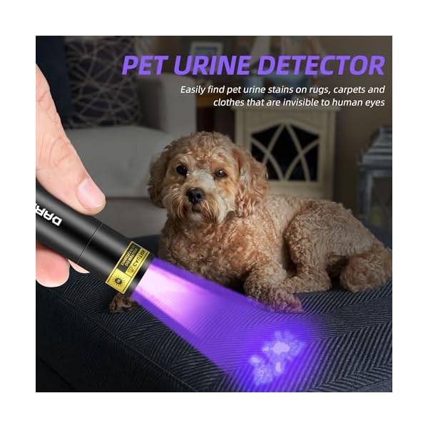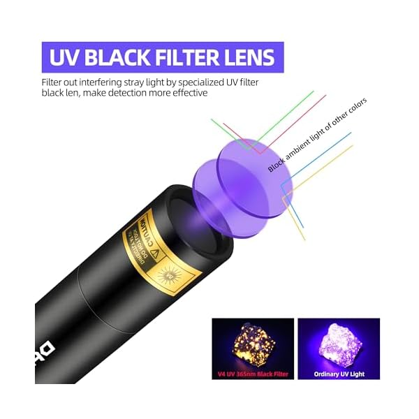 [Filtered UV 365nm Light with Better Detection Effect]: Equipped with hard toughened black filter that can filter out purple visible light, and release purer invisible ultraviolet light for demanding detection needs like rocks hounding or antique appraisal. The mini handheld pet dried urine detector also good for curing uv resin and will make your daily life easier! ATTENTION: DO NOT TWIST THE TOP to avoid causing the uv flashlight to stop working