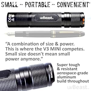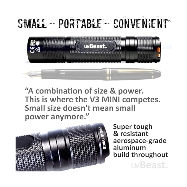 Attention: Double click to turn ON. Switch is not faulty. WHY V3 365nm MINI? Aimed at those who need a smaller more portable device but still want uvBeast UV power. Using a UV LED from the larger and renowned uvBeast V3 365nm model, the MINI is a smaller, lighter, convenient package which slips into your pocket but still packs a hefty UV punch! Upgraded features [Oct2023 Ed.]: More UV 365nm power, Wider UV beam, Longer working time, Accidental operation protection
