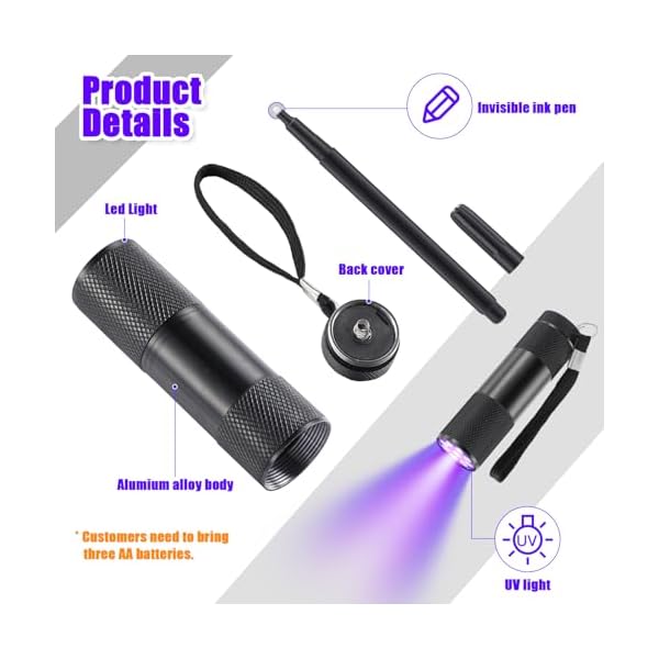 Usage Instructions: while our invisible ink pen with light add fun and functionality to your life, it’s important to note that they are invisible or colorless in normal light, and to witness the glowing effect you must have a black light; Keep in mind that UV lights do not include AA batteries