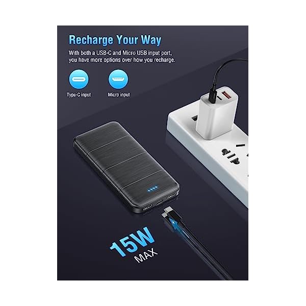 Power bank is equipped with USB-C and Micro USB input ports, which can fully recharge itself in just 4-5 hours at 5V 2.0A.(Note: Type-C port can only input, does not support output) .
