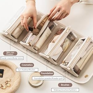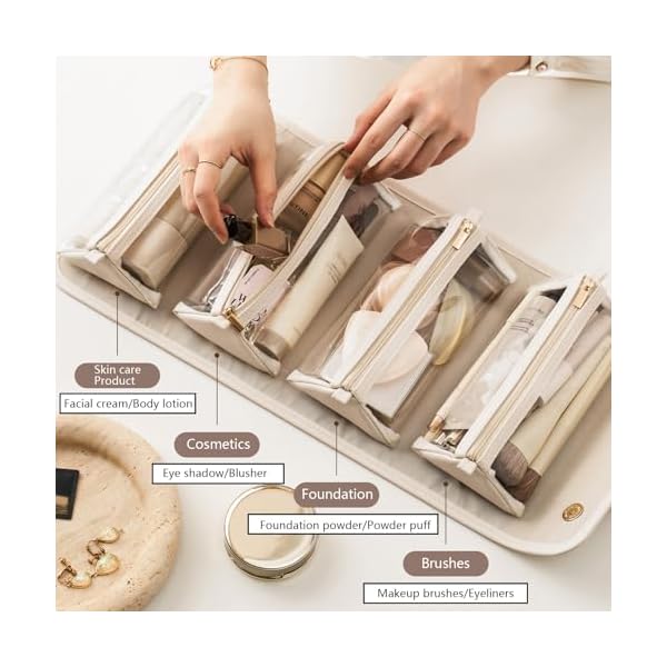 New Design✅:The Travel Makeup Bag features a brand new design – the interior contains 4 separate pouches to store your makeup and toiletries in separate sections, while also allowing you to separate wet and dry items. The makeup bag contains a customized metal magnetic closure that makes cosmetic bag easier to close and travel with ease!