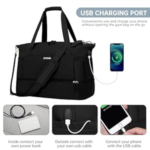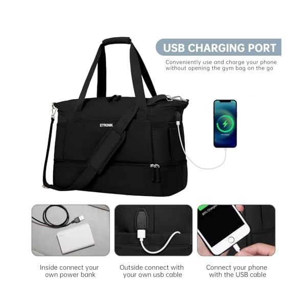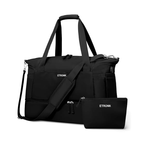 ETRONIK Gym Bag for Women, Personal Item Travel Bag with Shoes Compartment, Weekender Overnight Duffel Bag with Wet Pocket & USB Charging Port, Carry On Bag for Women, Travel, Gym, Weekend (Black)