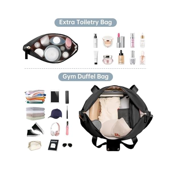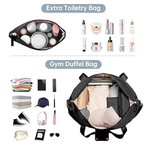 Dry Wet Separate Duffel Bag:This duffle bag for women offers a spacious main compartment to store your clothes and items. A zippered waterproof PVC lined pocket for wet clothes or towels and swimsuits. In addition, this travel duffel bag also gives an extra small makeup bag for easy storage