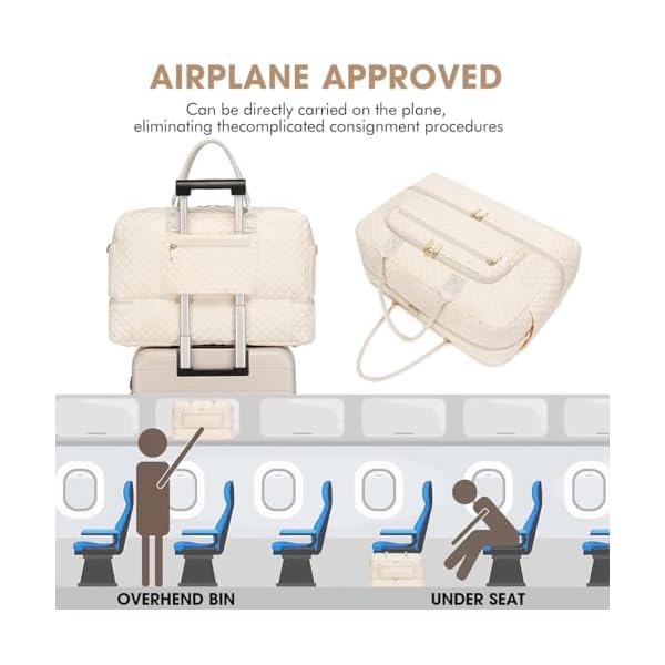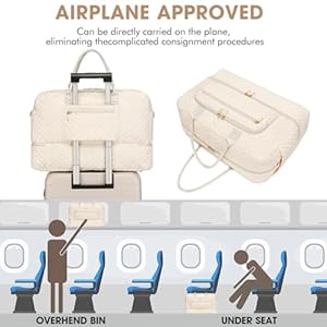 Airplane Friendly Carry on Bags: The duffle bag is 20.5 x 8.5 x 12.7 inch. Women duffle bag meets most international carry-on requirements. Fits in the overhead compartment as well as the under seat as Personal Items in flight. 2.1 lbs weight. The capacity is 35L. Luggage strap on the back of the travel duffle bag can be inserted and secured to the handle of the luggage, freeing your hands on a business trip. One zippered pocket on the back to hold your smart phone, IDs or passport
