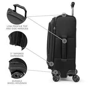 Carry on has PrecisionGlide System that delivers precise control and effortless roll on eight ultra-durable, 360° MagnaTrac self-aligning spinner wheels led by an airline-grade Patened PowerScope aluminum extension handle that minimizes wobble and has 4 stops at 36″, 38”, 40” and 42.5” for users of different heights with comfortable Contour Grip.