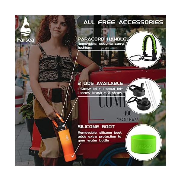 WHAT YOU’LL GET: Farsea is committed to providing the best value and highest quality to the customers; We offer Continuous After-sales Service and Solve All Problems; We offer several different capacity bottles(12 oz, 18oz, 24 oz, 32 oz, 40oz) and you can choose according to your needs; Package: Comes with 2 lids (Straw lid & Spout Lid), paracord holder, protective Silicone Boot, nice packing box, 2 straws, and straw brush