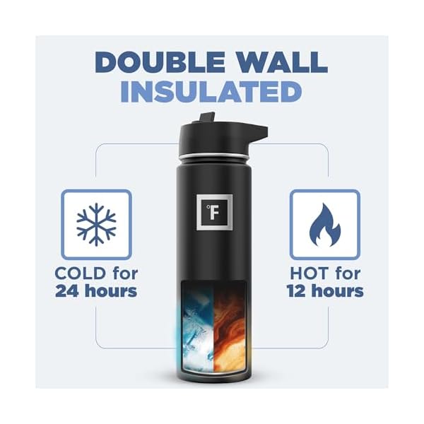INSULATED SPORTS WATER BOTTLE: Goodbye sweat! The double wall insulation makes the Iron Flask sweat-free! It keeps your drink COLD for up to 24 hours, and HOT for up to 12 hours. *NOTE: ONLY the 14 Oz, 18 Oz, & 22 Oz fit in cupholders*