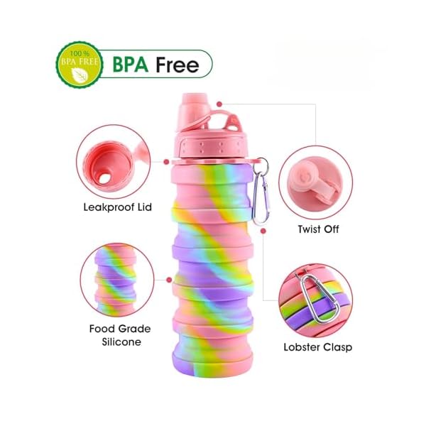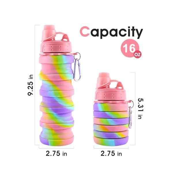 Rainbow Collapsible Folding Water Bottles for Kids, Students, Adults, Reusable BPA Free Silicone Foldable Sports Water Bottles for Travel Camping Hiking, Pink
